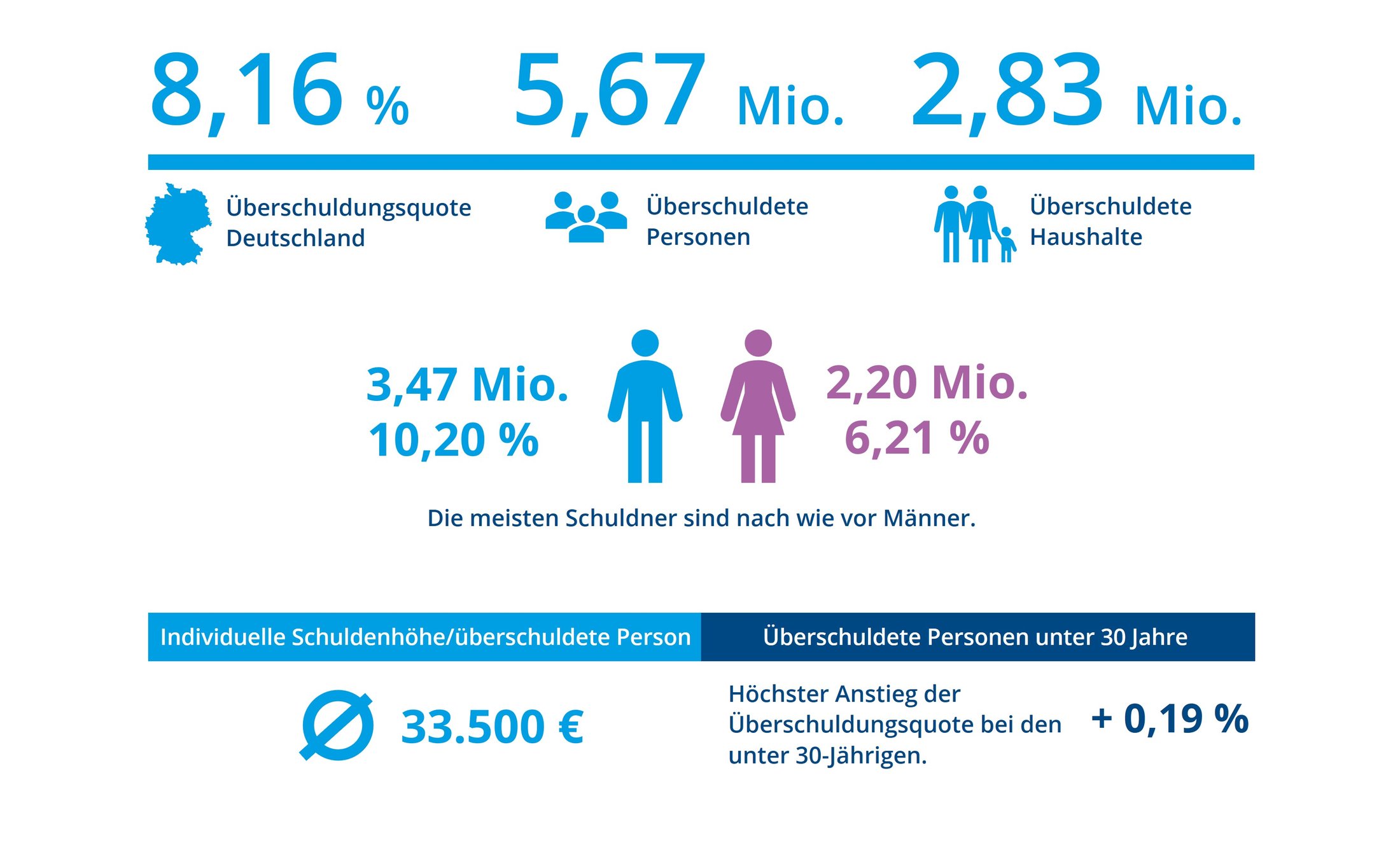 Nach sechs Jahren rückläufiger Zahlen kehrt die Überschuldung in Deutschland zurück: 2025 sind wieder 5,67 Millionen Menschen über 18 Jahre überschuldet – 111.000 mehr als im Vorjahr (+ 2,0 Prozent). Die Überschuldungsquote steigt auf 8,16 Prozent (2024: 8,09 Prozent). Damit verzeichnet Deutschland erstmals seit 2018 wieder einen spürbaren Anstieg.